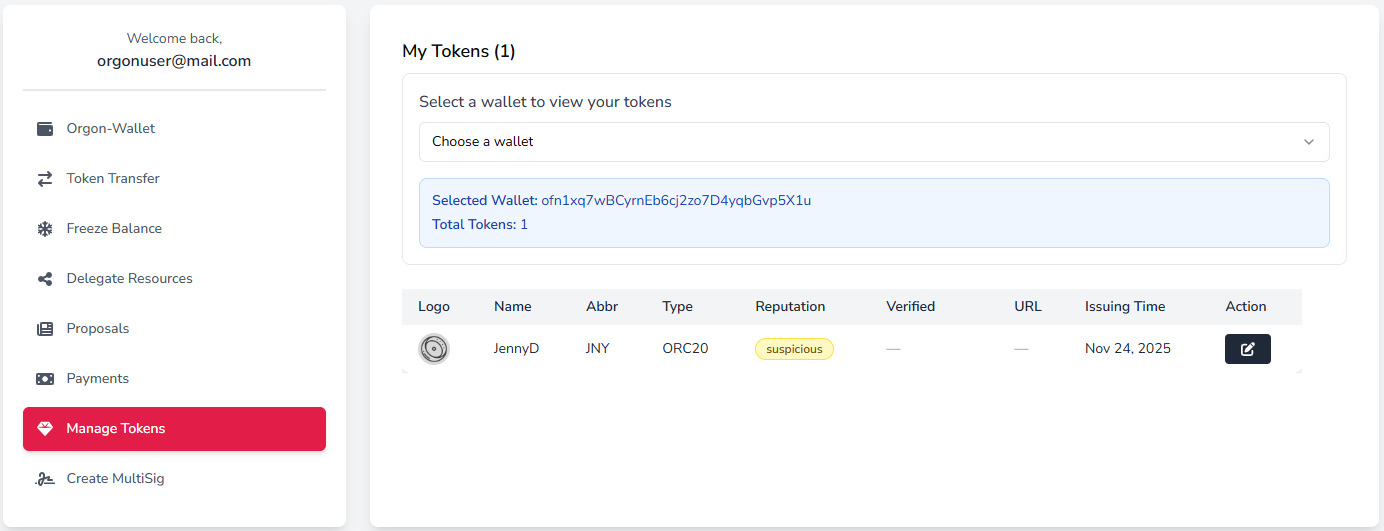 Для внесения данных необходимо выбрать кошелёк, с которого создавался токен, и подтвердить изменения подписью приватного ключа. После проверки администратором Orgonscan токену будет присвоен соответствующий статус верификации, который отобразится на его странице.