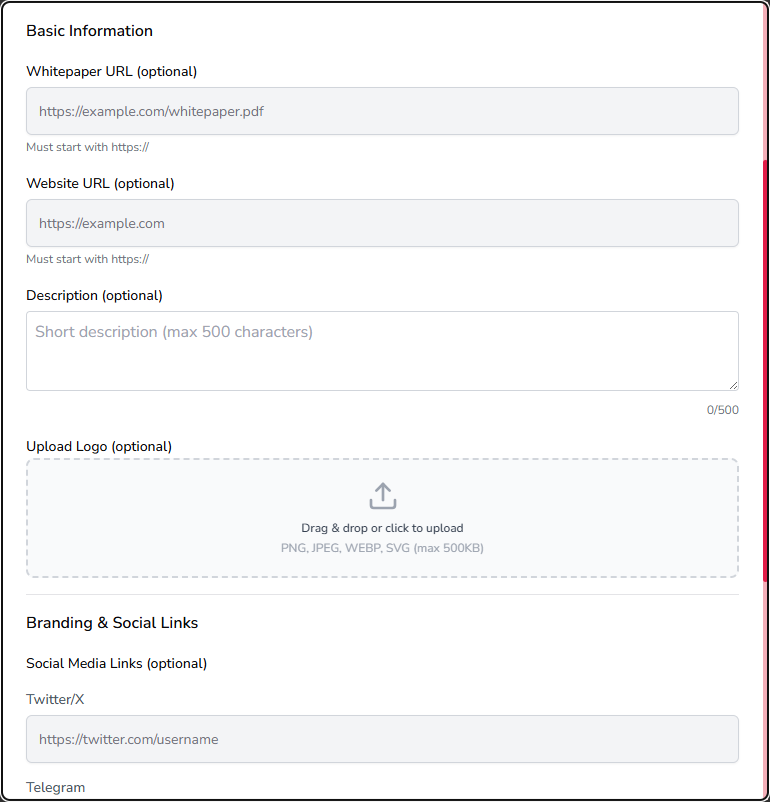 В разделе можно добавить ссылки на сайт, whitepaper, социальные сети, указать краткое описание и загрузить логотип.